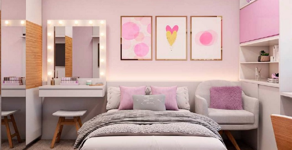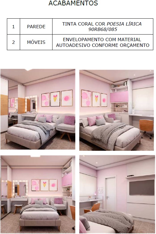 Este projeto de Design de Interiores visou criar uma suíte funcional e confortável para uma adolescente muito sonhadora de São Paulo, com soluções criativas para aproveitar ao máximo o espaço disponível. O trabalho inclui a seleção de móveis e objetos decorativos adequados, bem como a escolha de cores e materiais que complementem o ambiente.